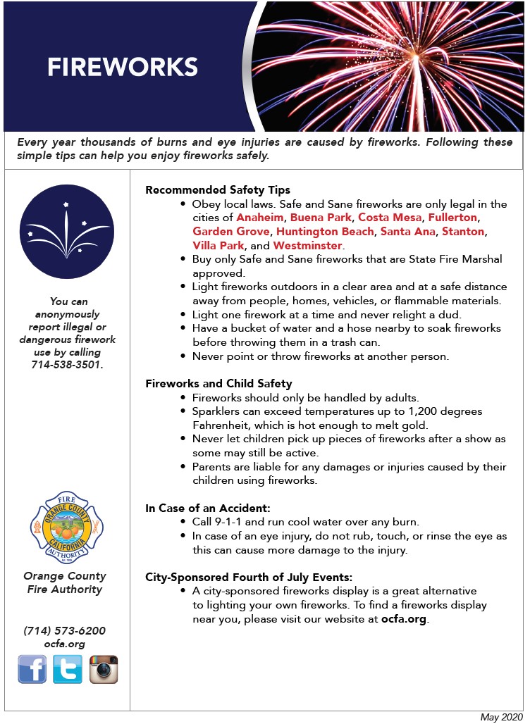Be sure to be safe when using fireworks. Stay ten (10) or more feet away from houses, garages, vehicles, utility lines, and vegetation. For more fireworks safety tips, tune into channel 99 for AT&T subscribers, channel 3 for Time Warner subscribers, or on the homepage of the Villa Park website. The City of Villa Park will also be airing a Fireworks Safety and Education Program on its TV channel at 8:00 AM, 9:30 AM, and 4:00 PM everyday.